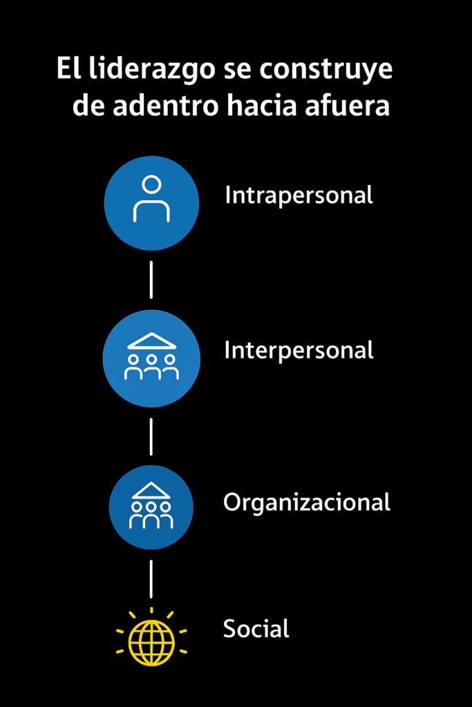 El verdadero liderazgo es un proceso expansivo que avanza de adentro hacia afuera, desde la gestión de uno mismo hacia la influencia sobre otros, las organizaciones y finalmente la sociedad. Como círculos concéntricos, el liderazgo se edifica progresivamente desde la vida interior, transformando primero al líder y luego su entorno. De lo intrapersonal a lo interpersonal, de lo interpersonal a lo organizacional, de lo organizacional a lo social.