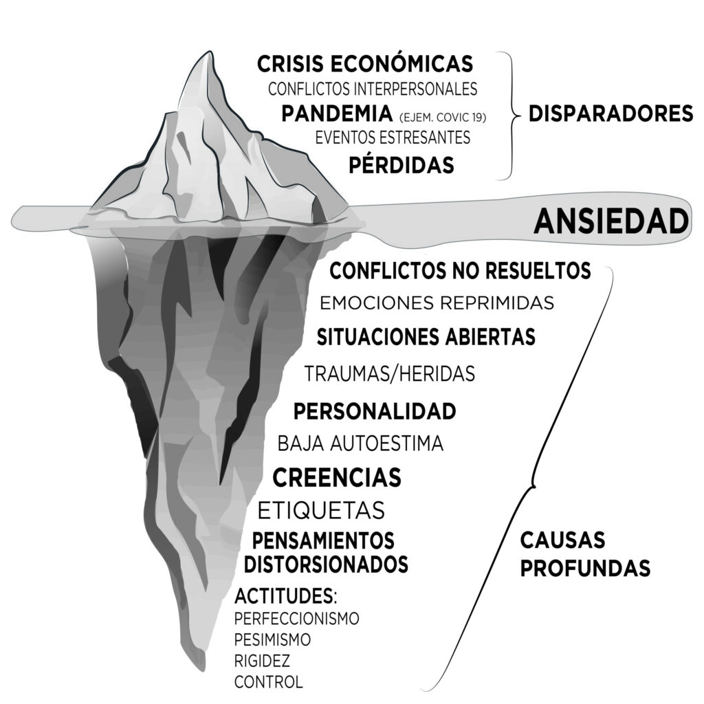 La metáfora del iceberg ayuda a entender cómo se origina y opera la ansiedad. El iceberg tiene una parte de su estructura que sobresale de la superficie (1/8), mientras que 7/8 partes están sumergidas. La parte del iceberg que sobresale de la superficie representa los disparadores o eventos y circunstancias que trabajan sobre los factores internos, que representa la parte del iceberg que está debajo de la superficie del agua, y que representa la parte más determinante en la aparición y gestión de la ansiedad.