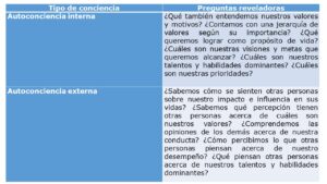 Podríamos describirlo como consciencia interna (la forma en que entendemos nuestro yo interno) y conciencia externa (comprenderse desde el exterior, vale decir, saber la forma cómo nos ven los demás, cómo entendemos las percepciones que otras personas tienen de nosotros).